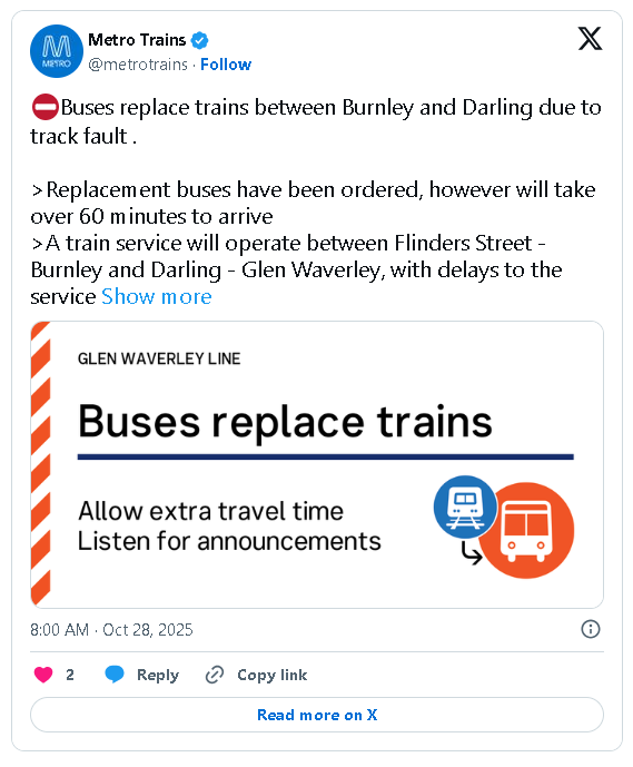 今早,墨尔本东南区的 Glen Waverley 火车线突发故障,
