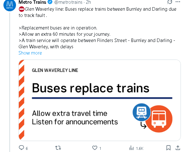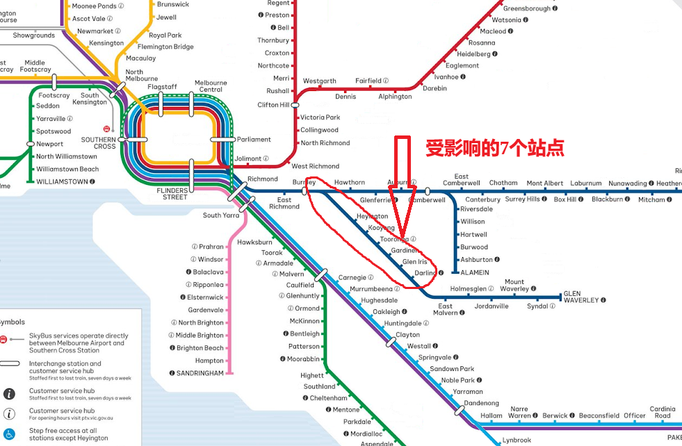 火车仍在 Flinders Street – Burnley 和 Darling – Glen Waverley 区段之间运行,但可能会延误。