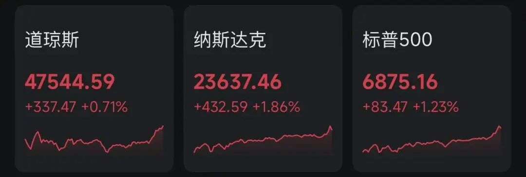 美东时间周一,美股三大指数集体收涨,均续创新高。截至收盘,纳指涨1.86%,标普500指数涨1.23%,道指涨0.71%。