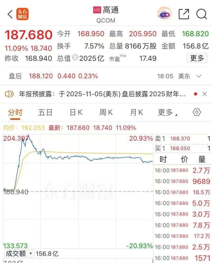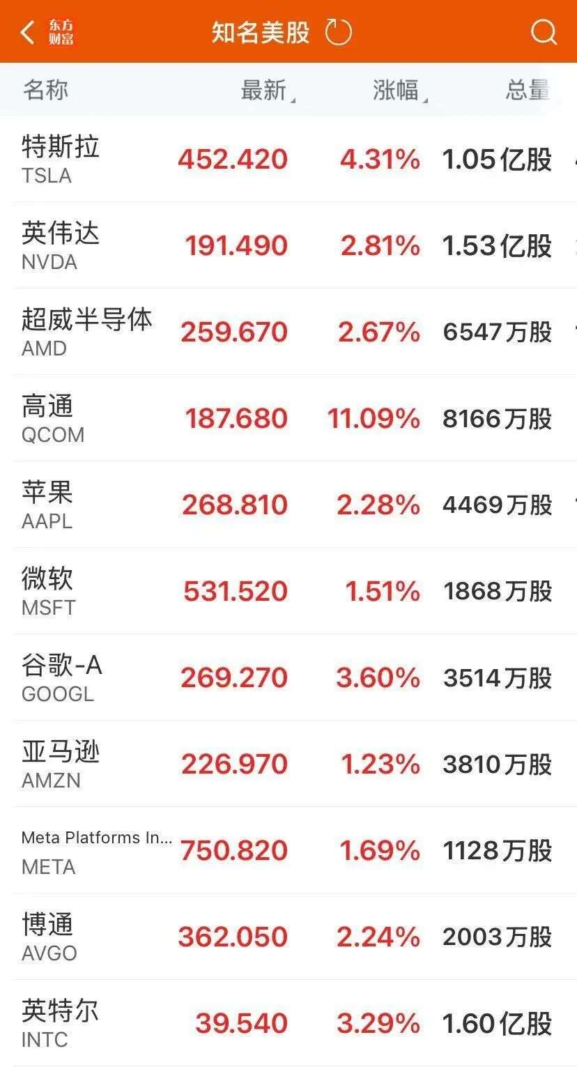 半导体股普遍上涨,高通涨超11%,英特尔涨超3%,AMD涨超2%。