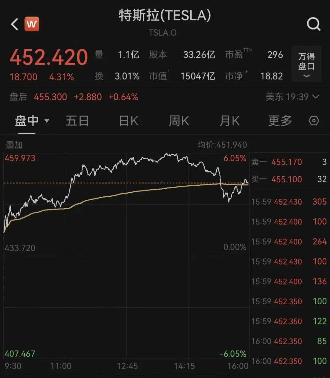 美股周一,特斯拉涨超4%,报452.42美元,最新市值为15047亿美元。