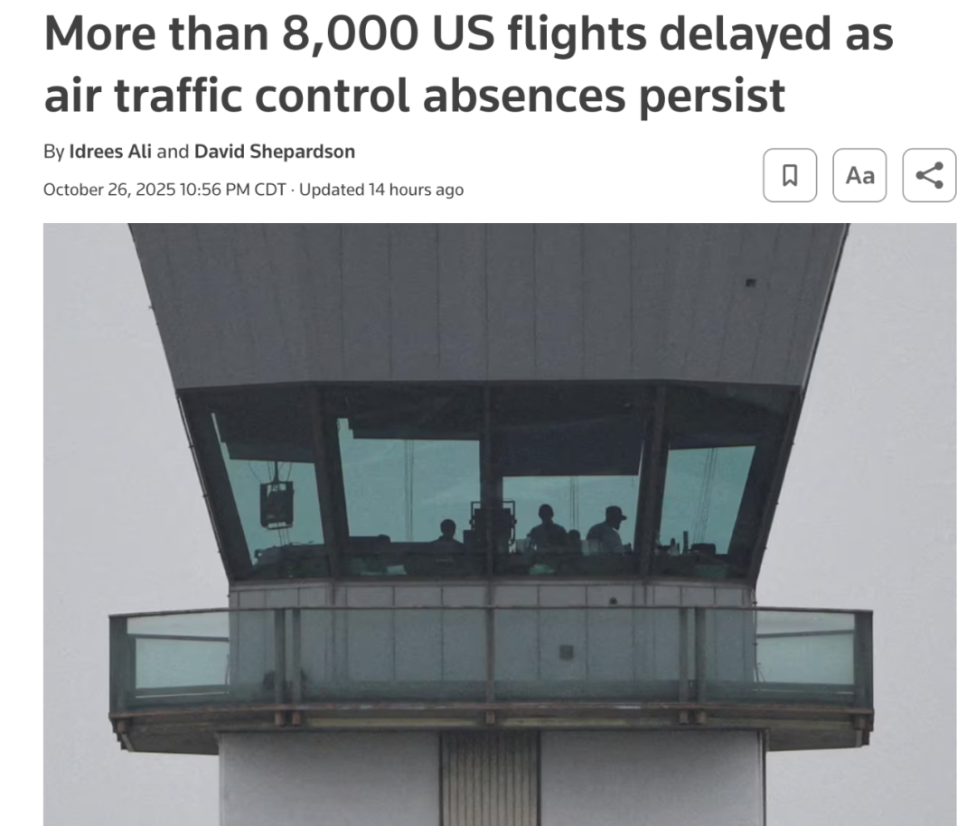 10月27日,美国政府停摆持续发酵,全美航空系统几乎被“瘫痪”!根据联邦航空管理局(FAA)最新数据——