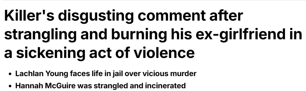 墨尔本微生活 10-28 10:20 年仅23岁的维州教师助理Hannah McGuire原本是朋友眼中温柔善良的女孩,却惨死在自己最熟悉的家中。Young是一名控制欲极强的男人,无法接受分手的事实。最终,在二人共同购买、位于Ballarat的房子里,Young用双手掐死了Hannah,然后纵火焚尸,试图伪造成一起“自焚自杀”。令人发指的是,Young在掩饰罪行时,甚至还能与堂兄谈笑风生。当堂兄提到他以前总夸Hannah“漂亮又性感”时,这个瘦骨嶙峋、留着土气长发、暴牙突出的男人冷冷回了一句:“现在更性感了,不是吗?”在本周一维州最高法院的量刑听证会上,这起案件的细节第一次被公开。
