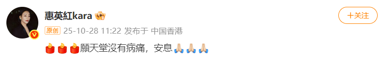 许绍雄去世消息公布后,惠英红发文悼念:“愿天堂没有病痛、安息。”