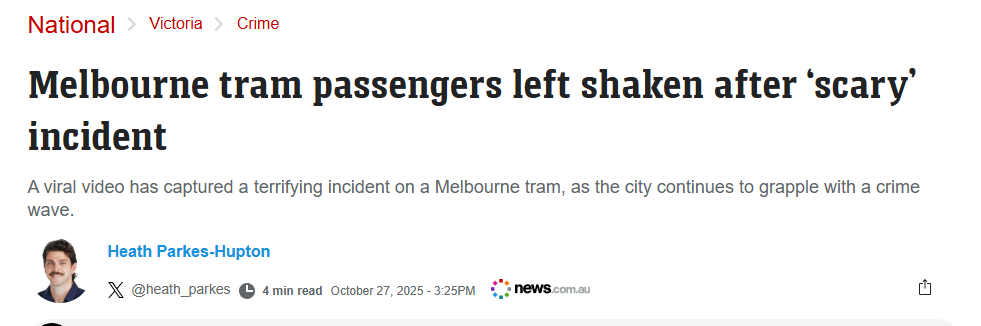 但是乘客表示,已经被吓傻,然后开始感叹墨尔本现在的犯罪率,日常出门都变得不安全了。