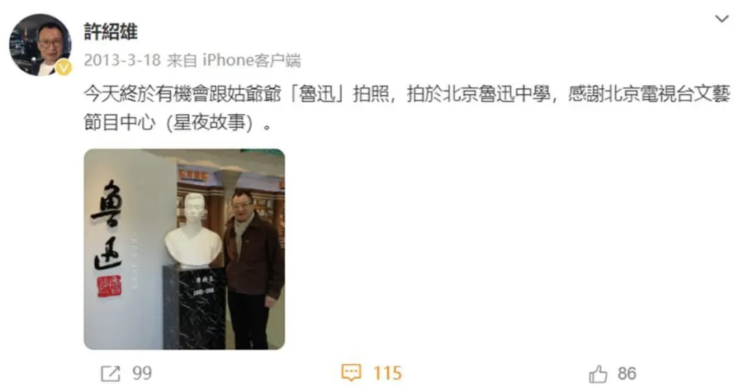 此前,许绍雄曾在个人社交账号上晒出一张与鲁迅长孙周令飞的聚会照,他亲切地喊对方为表弟。