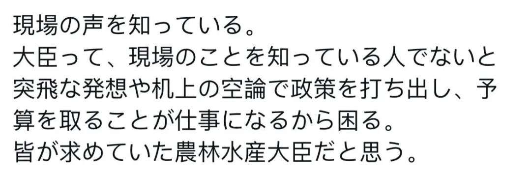 他是真的听到了来自一线的声音。 大臣这种职位,如果本人不了解实际情况,就容易凭空想或纸上谈兵来制定政策、申请预算,这才是最让人头疼的。 我觉得他正是大家一直期待的农林水产大臣。