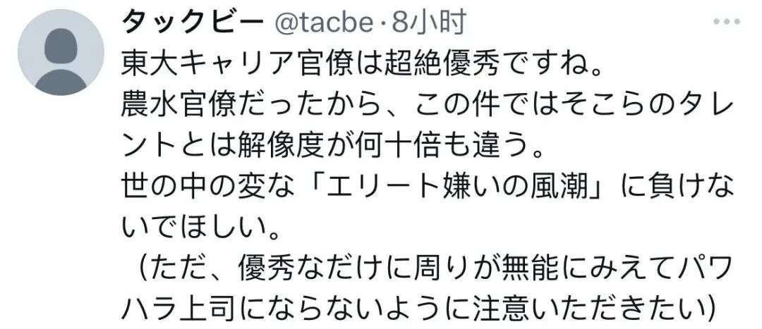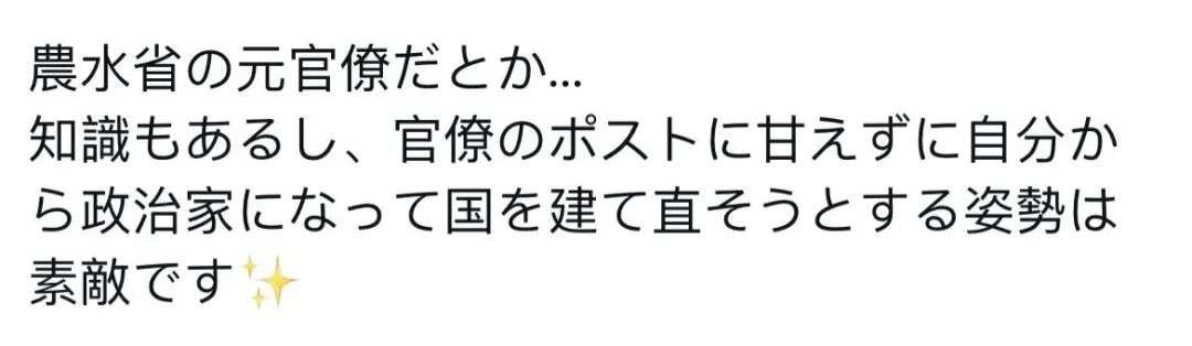 正因为他曾是农林水产省的官僚,所以在这件事上的认知水平,比那些普通艺人高出几十倍。 希望他不要向社会上那种奇怪的“反精英风潮”低头。 (不过,正因为太优秀了,容易觉得周围的人都无能,还请务必注意不要变成一个职场霸凌的上司。)