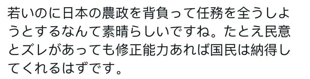如此年轻就决心肩负起日本农业政策的重任,并努力完成使命,实在令人敬佩。即使他的观点与民意有所偏差,只要具备修正的能力,民众也一定会理解并支持他。