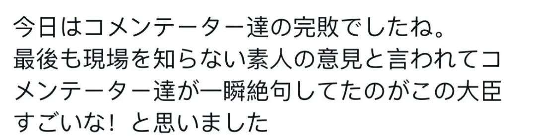 今天各位评论员彻底被比下去了。 当他最后说出“你们这些不了解现场的外行人的意见”时,评论员们瞬间哑口无言,那一刻我深深觉得这位大臣真的很厉害!