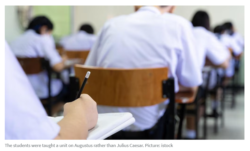 这意味着学习古代史的学生,包括布里斯班州立高中学生——将在周三参加一场仅有一天准备时间的考试。这些学生在整个学年中被教授关于罗马皇帝Augustus的内容,而他们本应学习其前任Julius Caesar的相关知识。