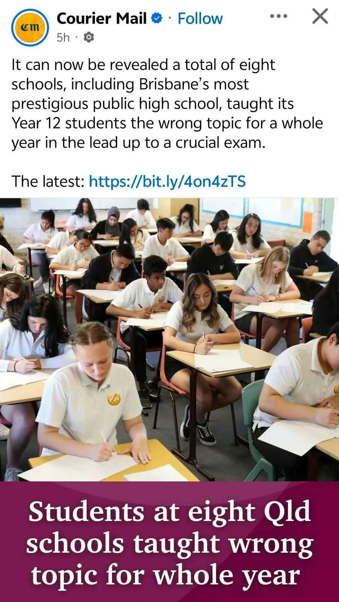 继Brisbane State High School被曝出教学内容出错后,周二晚间最新消息显示,另有七所昆士兰学校陷入同一失误,其中包括Flagstone State High School及其他多所公私立学校,此次教学乌龙事件的影响范围正进一步扩大。