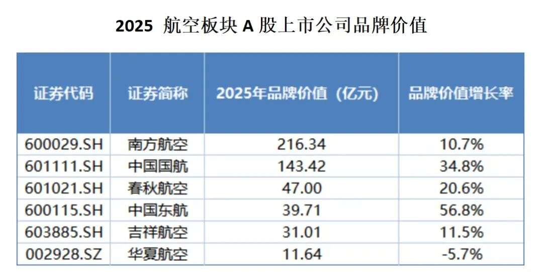 据每日经济新闻与清华大学经济管理学院中国企业研究中心联合发布的“2025中国上市公司品牌价值榜”,航空业品牌价值前三位为南方航空、中国国航及春秋航空,春秋航空的品牌价值增长率高达20.6%。