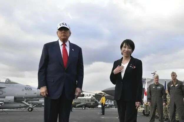 当地时间10月28日,特朗普在美军“乔治•华盛顿”号航空母舰内,与日本新任首相高市早苗一同向数千名驻日美军士兵发表了演讲。