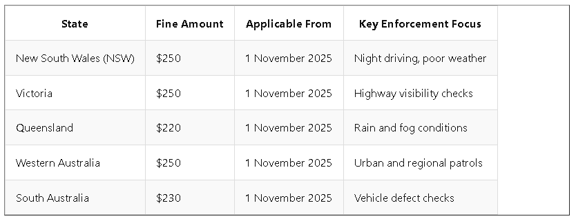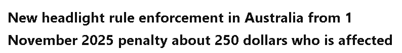 从 2025年11月1日 起,澳洲司机如果车灯有问题、没开灯、或用错灯,可能会被罚 约$250澳元。