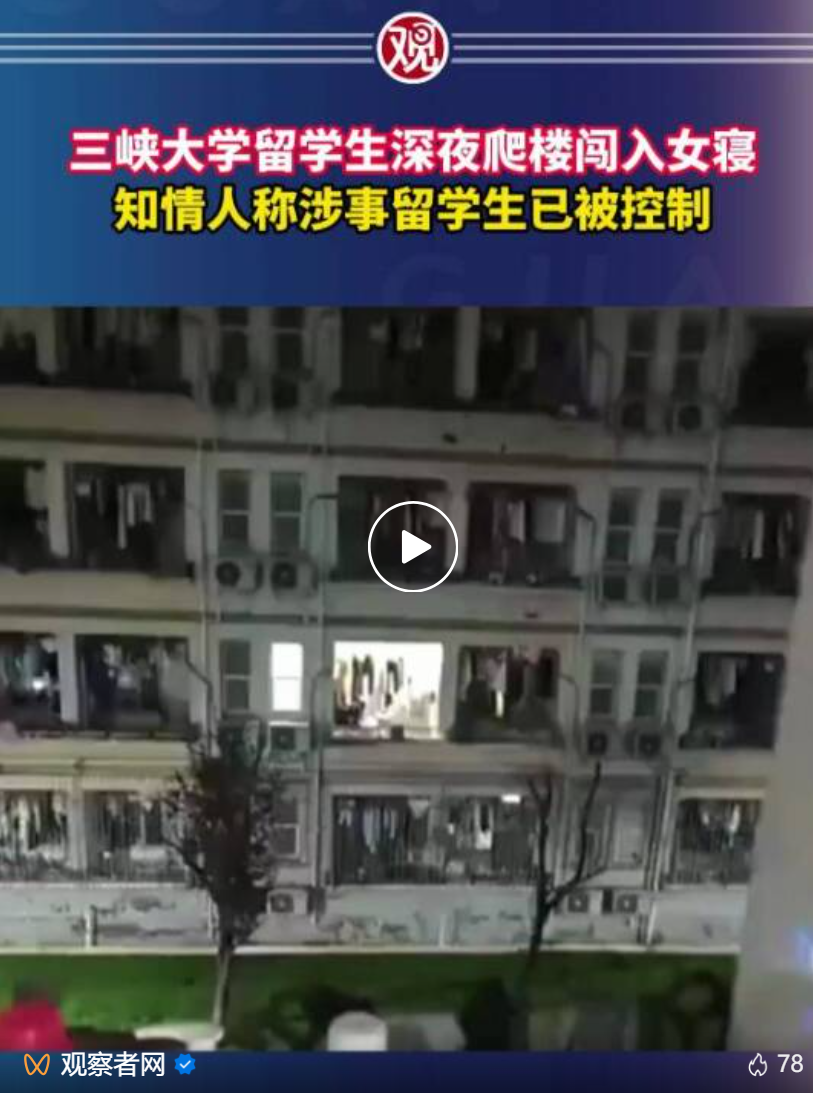 新闻报道提到:10月25号凌晨两点,夜深人静,大多数人睡得正沉的时候,三峡大学南苑女生宿舍里,发生了一件让人脊背发凉的事儿。一名留学生(文案里写的是黑人),也不知道是怎么想的,翻铁窗、爬二楼,愣是闯进了一间女生宿舍。