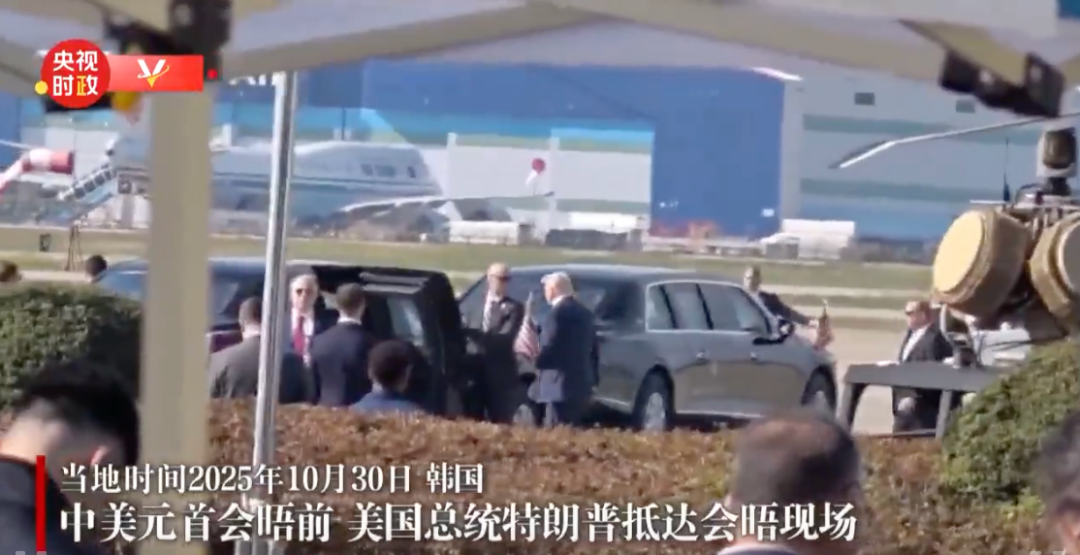 2025年10月30日上午,中美元首会晤前,美国总统特朗普抵达会晤现场。稍后习近平主席将在这里同特朗普总统举行会晤。