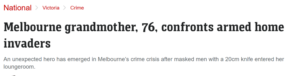 墨尔本Brighton East一位76岁的老太Pat,近日经历了一场惊心动魄的夜半入室抢劫。但令人震惊的是,面对刀光,她居然毫不退缩,怒喝“滚出我的家!”成功吓跑了歹徒!