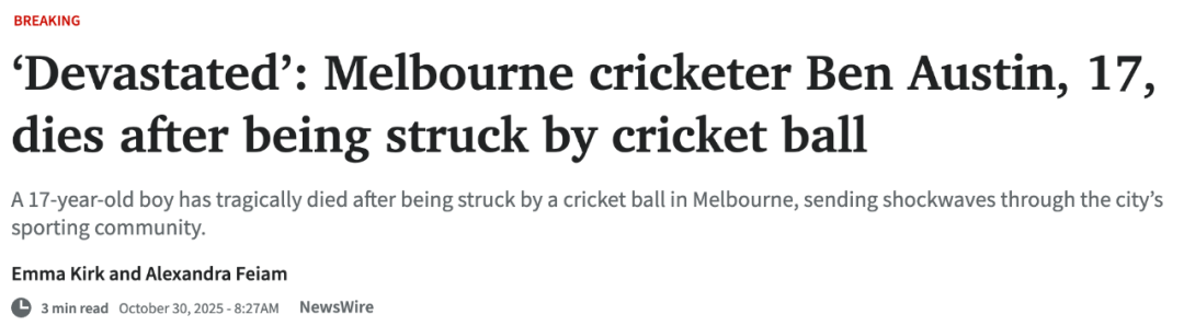 墨尔本17岁板球少年Ben Austin被球击中后不幸去世。