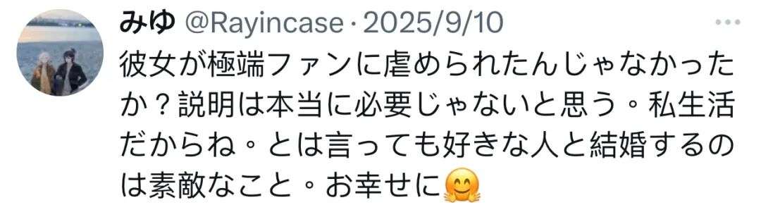 “她是不是曾被某些可怕粉丝网暴过?我觉得根本没必要解释,这是她的私事。话说回来,能和自己深爱的人结婚,是一件很美好的事情。祝你幸福!”