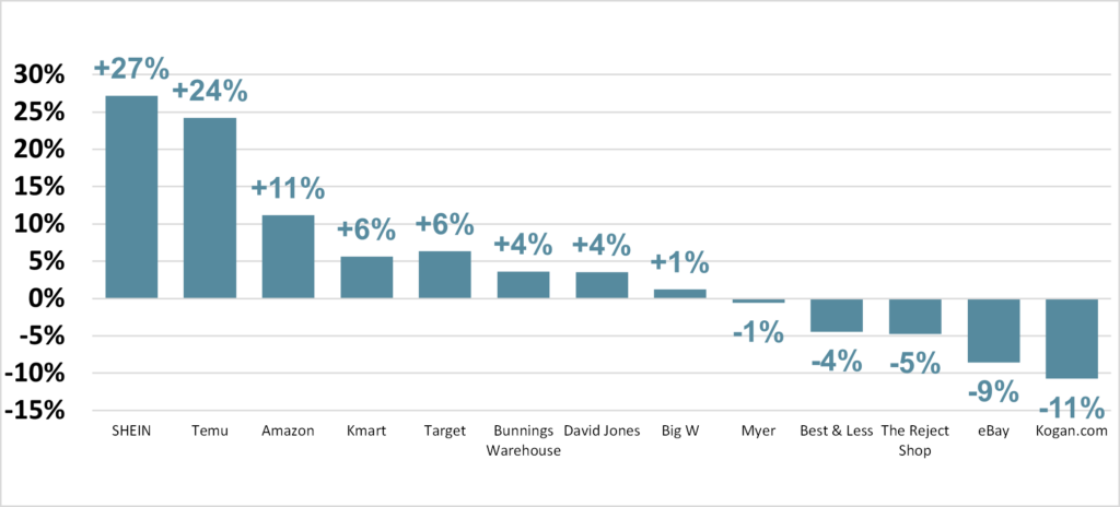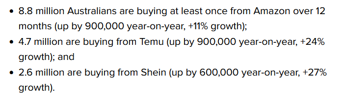 Roy Morgan的最新数据显示,Amazon、Temu和Shein正在快速抢占澳大利亚市场份额。Amazon用户达880万,同比增长11%;Temu用户470万,增长24%;Shein用户260万,增长27%。