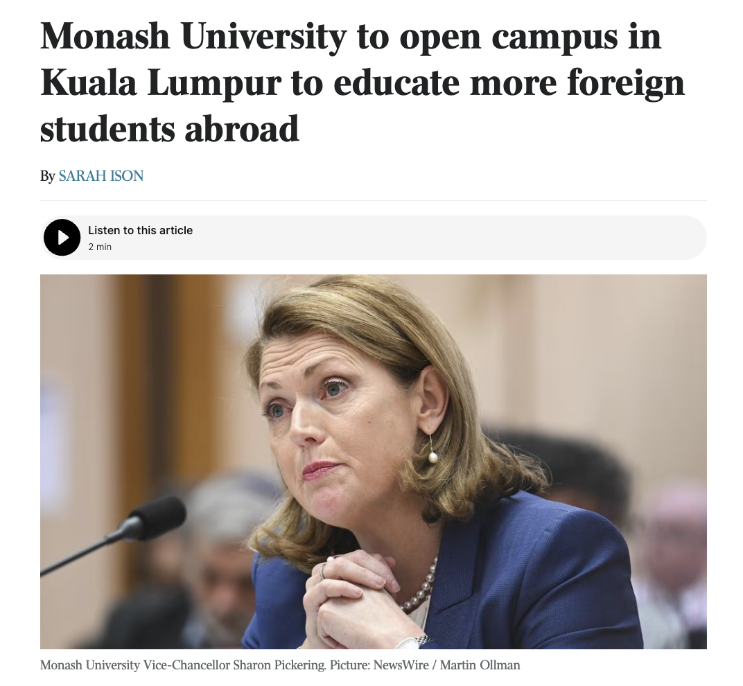 近日,蒙纳士大学宣布将在吉隆坡建设全新校区,预计到2040年容纳近2.3万名学生。而它不过是澳洲大学出海潮中的最新浪花。