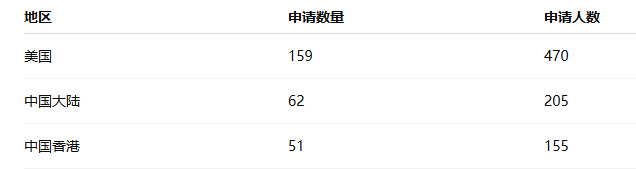其中,来自美国的申请159份,包括470位申请人;来自中国大陆的申请62份,包括205位申请人;来自中国香港的申请51份,包括155位申请人——占据了申请数量来源地前三。