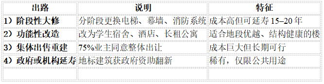 当楼龄进入40–50年,“重修”与“重建”的天平开始倾斜。