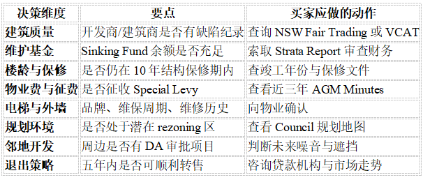 购入二手高层公寓前,更应该应仔细阅读近三年的 Strata Report,关注以下关键信号:是否存在“Special Levy”(特别征费);是否计划重修外墙、电梯或消防系统;以及是否有尚未解决的建筑缺陷或诉讼。这些项目往往直接决定未来五到十年的支出水平,也影响房产的实际回报率。