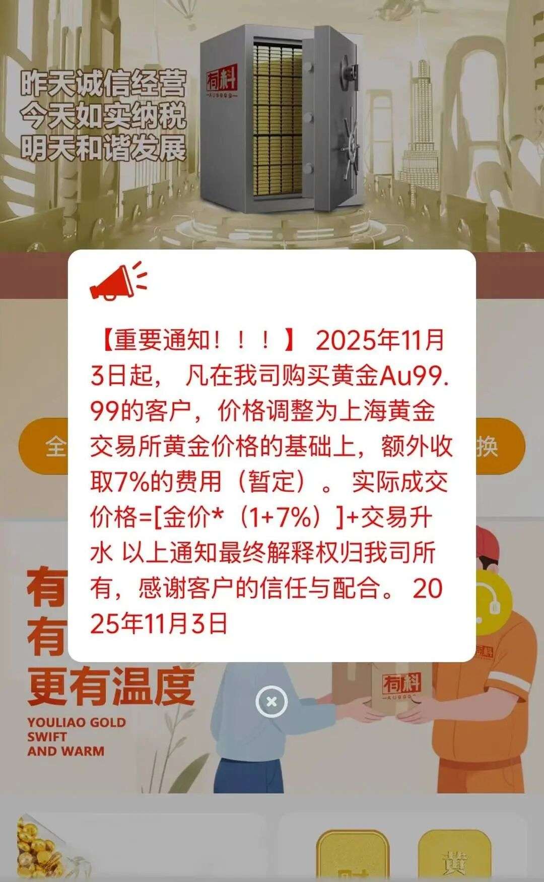 受此政策预期影响,全国黄金交易市场近几日已相继大幅提价。而11月3日,深圳水贝市场仍有部分料商以不含黄金税的价格销售板料,且要求当天付款取货。这一窗口吸引了全国各地投资者争分夺秒抓紧囤货,部分外省投资者因无法亲自到场,转而通过深圳同城跑腿服务紧急取货,上演了一幕“富贵险中求”的抢货场景。