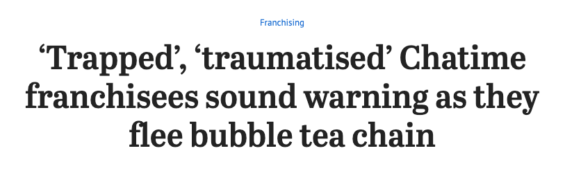 澳媒SMH近日的一篇重磅调查,炸出了Chatime奶茶加盟的“血泪真相”!揭露了加盟商“血亏、被逼疯”的内幕,引发澳洲各界强烈关注!