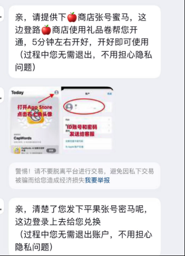 沟通中,卖家首先确认了冯平使用的是苹果手机,再以“需绑定苹果账号激活”为由,让其提供ID和密码。“我犹豫了一下,问‘为什么要密码’,对方说‘苹果设备都这样’。”冯平想到,自己平时购买商品付费时还需要进行人脸识别,觉得“应该没太大风险”,便将相关信息发送了过去。