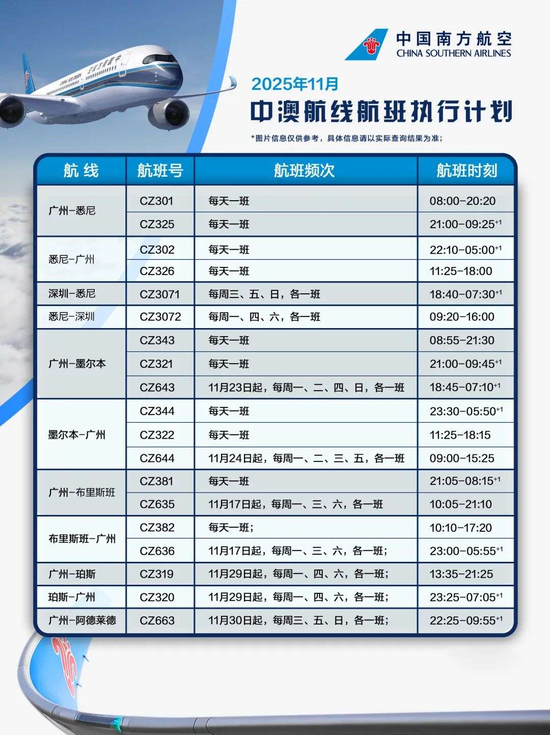 南航中澳航线2025年11月计划执行的航班信息来了,欢迎有需要的小伙伴点赞、收藏、转发!