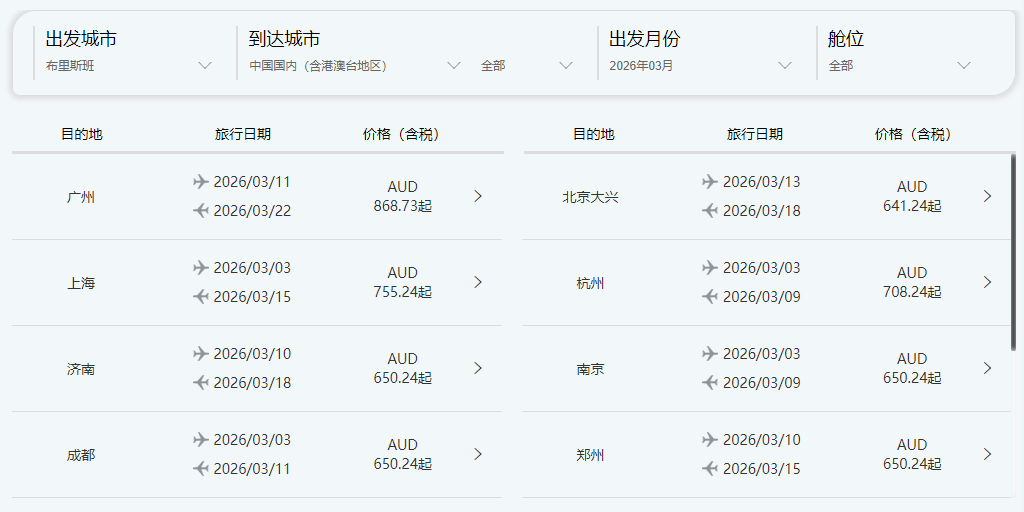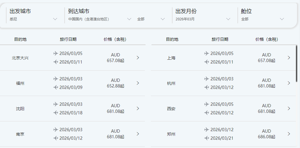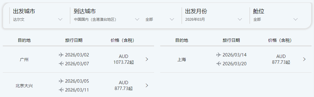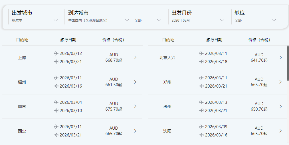 本次折扣活动适用于悉尼、墨尔本、布里斯班、达尔文始发至部分中国城市的航班,截取了部分特价给大家。