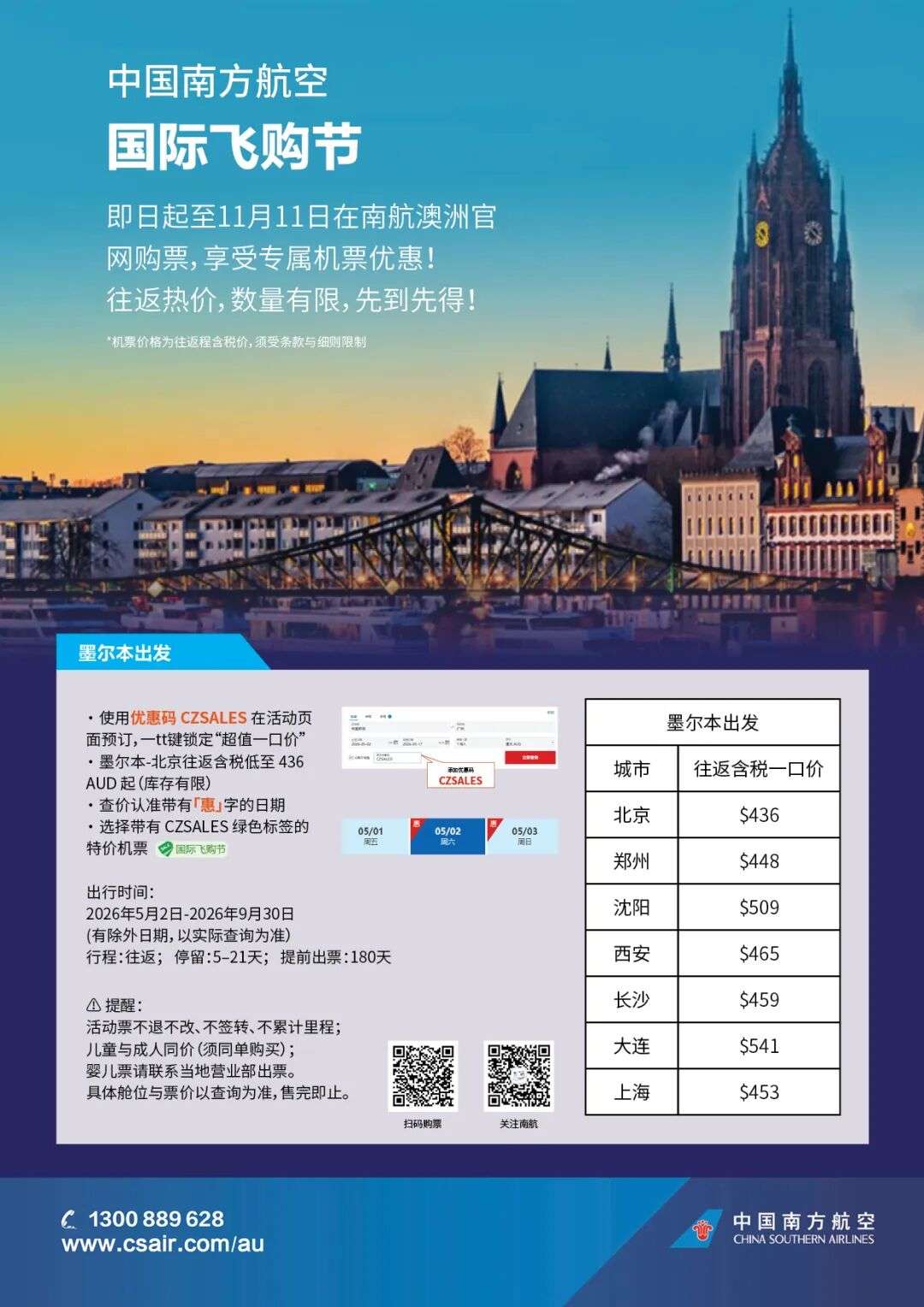 查询特价票请扫码,或者登录南航澳洲官网:https://oversea.csair.com/tk/au/zh/book/search?rc=SYD033