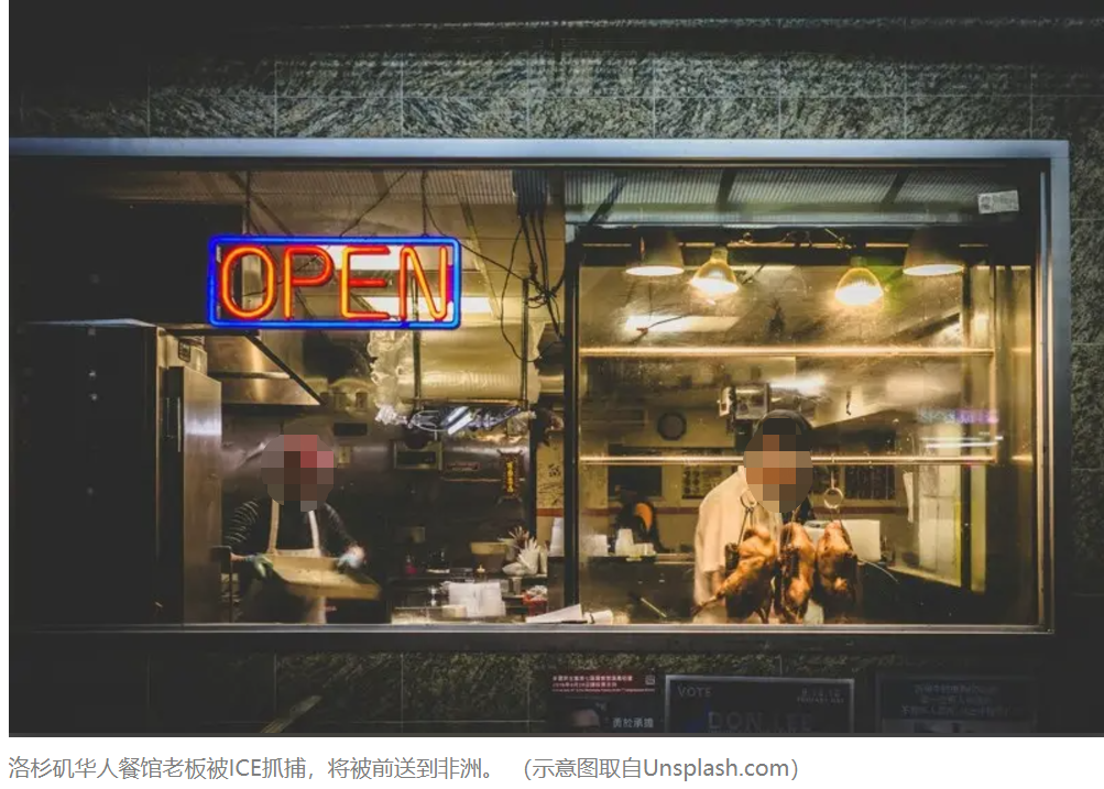 洛杉矶一名华人餐馆老板,日前被根据移民暨海关执法局(ICE)探员抓捕。据称,此人没有任何犯罪纪录,已在美国居住十多年,目前正面临被遣送到非洲国家。