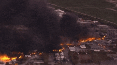 爆炸波及周围数公里的建筑,航拍画面显示飞机经过的一条线都燃起大火。