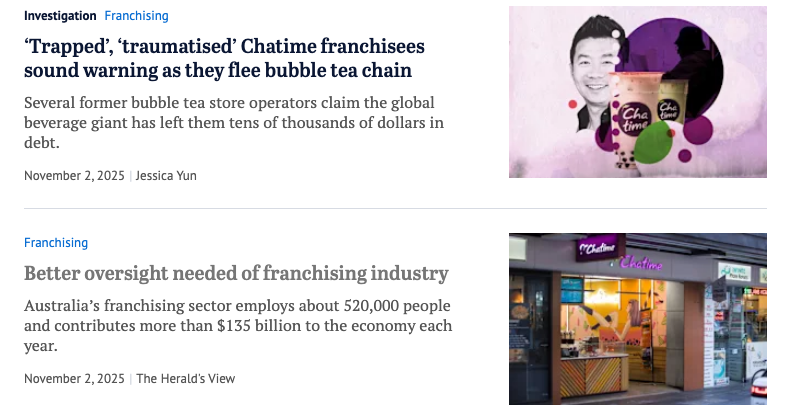 近日,澳洲《THE AGE》(时代报)发表一篇重磅调查,炸出了Chatime奶茶加盟的“血泪真相”!揭露了加盟商“血亏、被逼疯”的内幕,引发澳洲各界强烈关注!