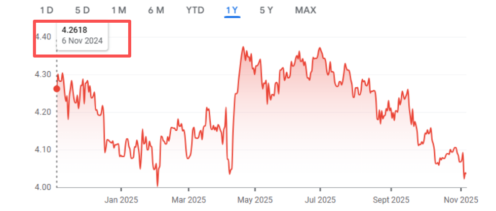 去年这个时候,纽币和人民币汇率差不多是4.26。