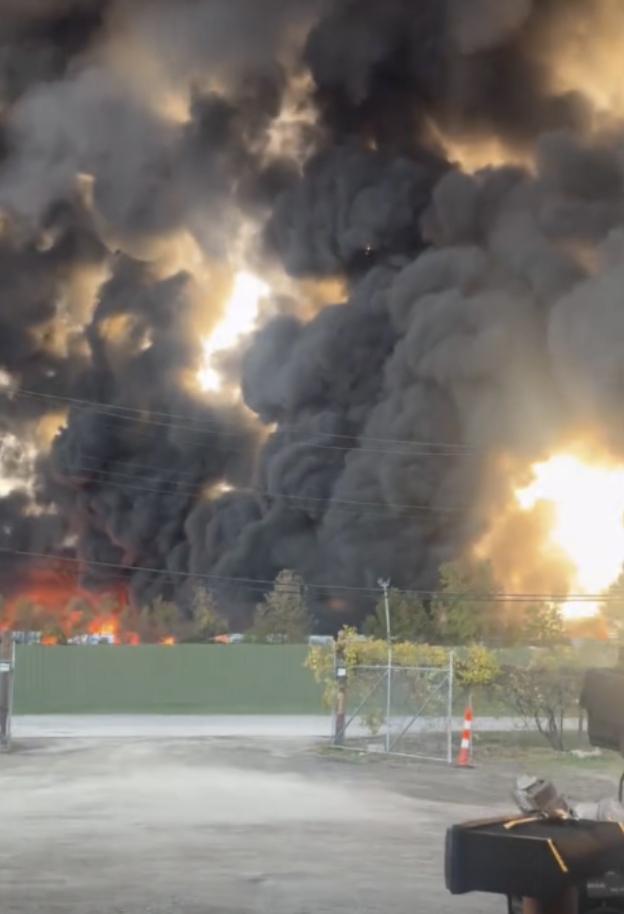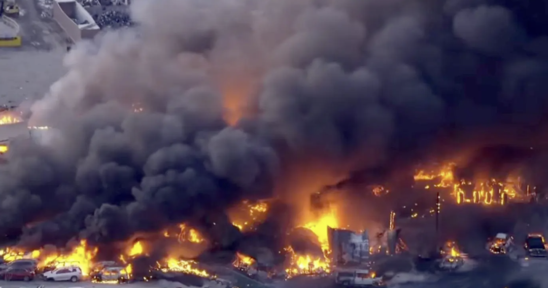 航拍视频显示,废旧卡车堆、金属厂房和地面碎片连成一片火海。