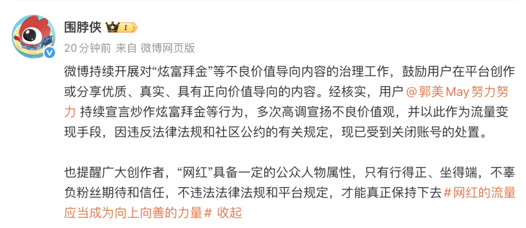 @围脖侠 发文:微博持续开展对“炫富拜金”等不良价值导向内容的治理工作,鼓励用户在平台创作或分享优质、真实、具有正向价值导向的内容。经核实,用户@郭美May努力努力 持续宣言炒作炫富拜金等行为,多次高调宣扬不良价值观,并以此作为流量变现手段,因违反法律法规和社区公约的有关规定,现已受到关闭账号的处置。