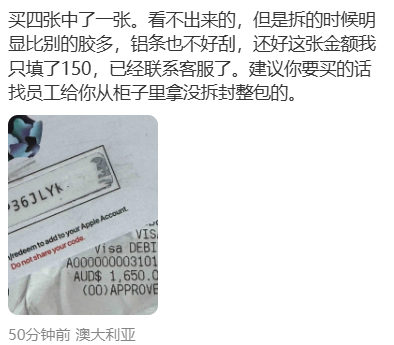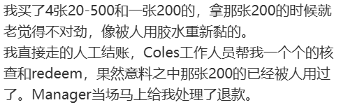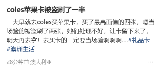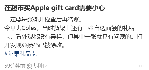 每当Woolworths和Coles推出苹果礼品卡打折时,总有不少消费者曝光盗刷现象。
