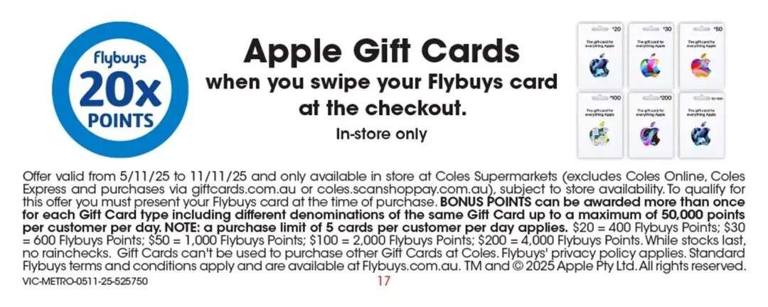自11月5日起至11月11日,大家在Coles购买苹果礼品卡可享20倍Flybuys积分,相当于九折优惠。