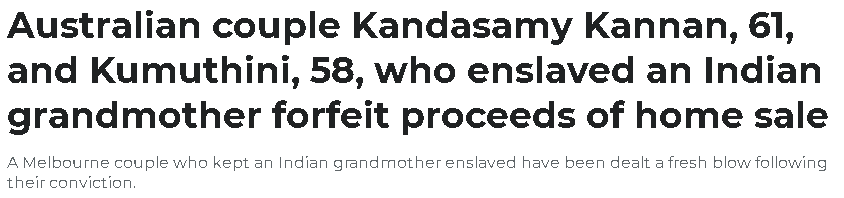 一对住在墨尔本东区 Mount Waverley 的夫妇,Kandasamy 和 Kumuthini Kannan,被判定在家中奴役一位来自印度的老妇人整整八年。