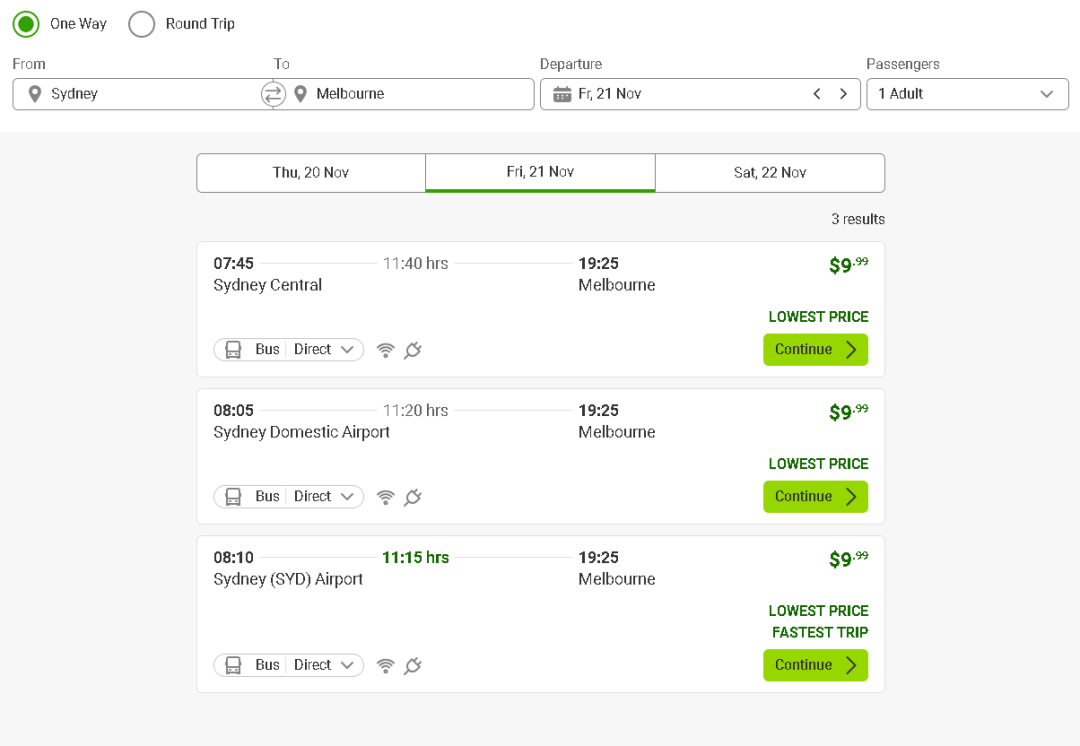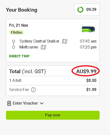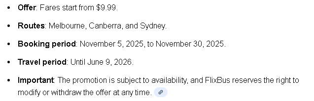 上面老墨给大家也测试过,FlixBus 在悉尼–墨尔本走廊“票价从 $9.99 起”!