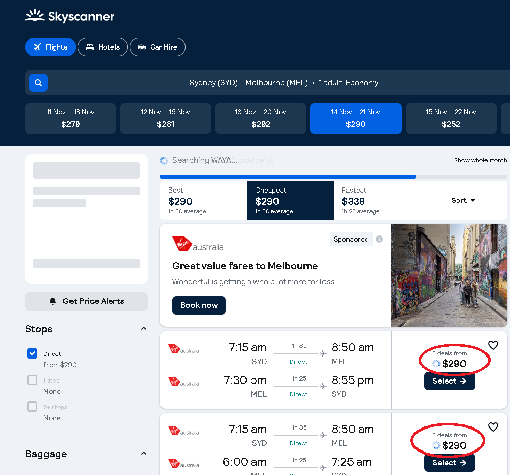 老墨用机票比较网站查询了下同一天,11月21日,悉尼飞墨尔本的机票价格,显示最便宜的$290: