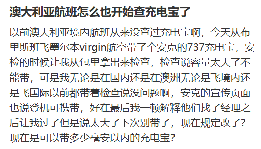 然而就在两天前,一名华人表示,自己在乘坐澳洲境内航班时也被查了充电宝。就在过安检的时候,她的充电宝被“拦”下了。
