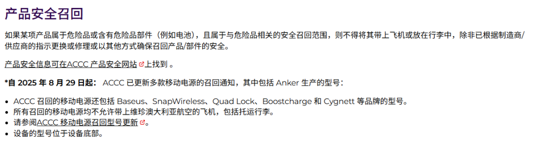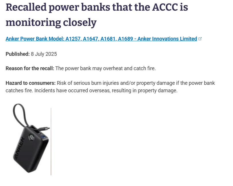 根据澳大利亚竞争与消费者委员会(ACCC)的公告,从2025年8月29日起,包括安克(Anker)、Baseus、SnapWireless、Quad Lock、Boostcharge和Cygnett等多个品牌的部分型号充电宝,都被列入召回名单。