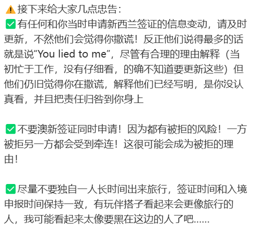 因此,这位华女也呼吁所有想前往新西兰旅游的人,及时更新签证信息,签证时间和入境申报时间保持一致,不要同时申请澳新签证,一方被拒另一方都会受到牵连。