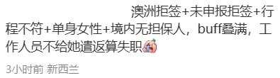澳新两国签证系统高度互通,一方拒签史会直接影响另一方的入境评估,且能拒绝她的理由实在太多。
